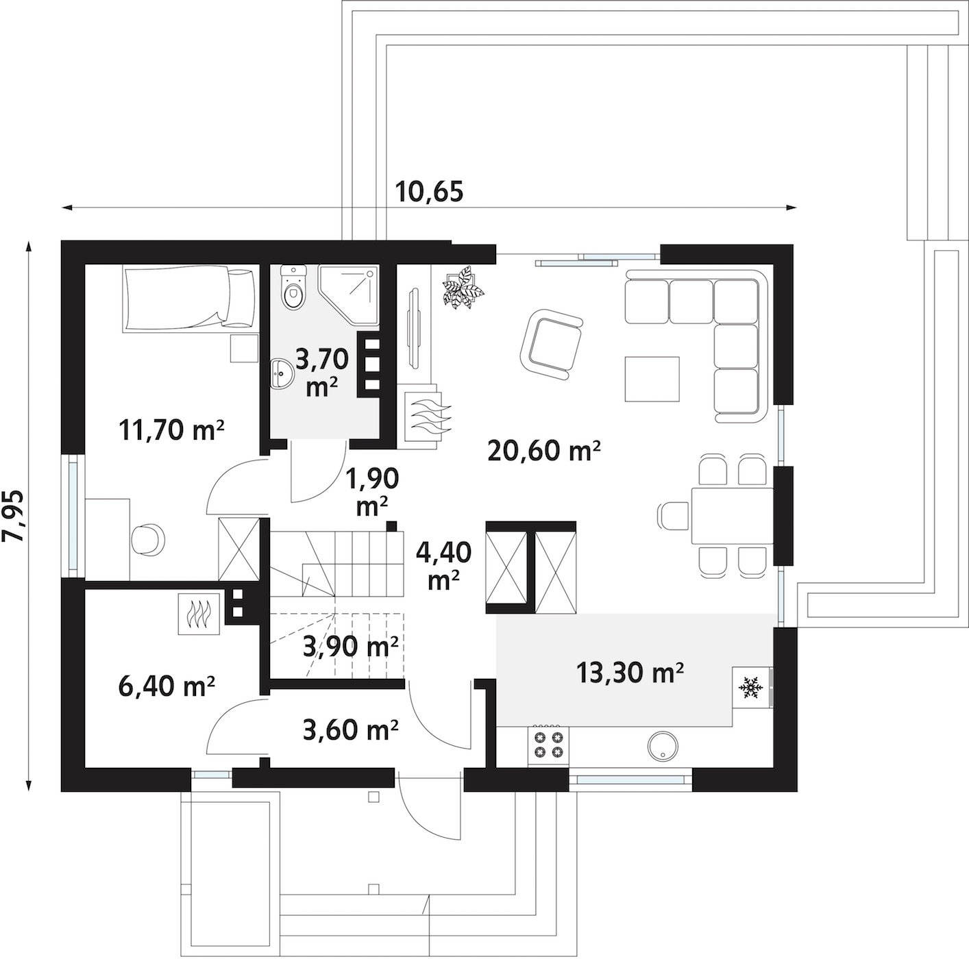 Jest to dom kompaktowy, który na niewielkie powierzchni realizuje i pozwala zaspokoić potrzeby inwestorów szukających domu dla 5 osobowej rodziny. Wejście do domu znajduje się w wiatrołapie, które prowadzi do części mieszkalnej, a także do kotłowni. To pomieszczenie techniczne jest dość dużych rozmiarów, więc spokojnie oprócz miejsca pod piec, może zastąpić piwnicę bądź składzik na rzadko używane przedmioty. Projekt domu Anka Dr-st to propozycja z podziałem na część dzienną zlokalizowaną na parterze, gdzie znajduje się jeden pokój. W zależności od liczby domowników, możemy go wykorzystać w rozmaity sposób – na pokój dla członka rodziny, pokój gościnny albo gabinet. Tuż obok znajduje się łazienka z miejscem na wc, prysznic oraz zlew. W dalszej części domu znajduje się pięknie przeszklony salon, dzięki czemu będzie nie tylko doskonale doświetlony, ale będzie wydawał się zdecydowanie większy niż jest w rzeczywistości. Nie zapomniano również o kominku przy którym będzie można zrelaksować się i odpocząć po ciężkim dniu albo w zimowy wieczór spędzić czas przy kubku gorącej herbaty. Przewidziano tu miejsce na jadalnię z dużym stołem, a także otwartą dużą kuchnię. Z salonu znajduje się bezpośrednie wyjście na taras za pomocą okien przesuwnych.