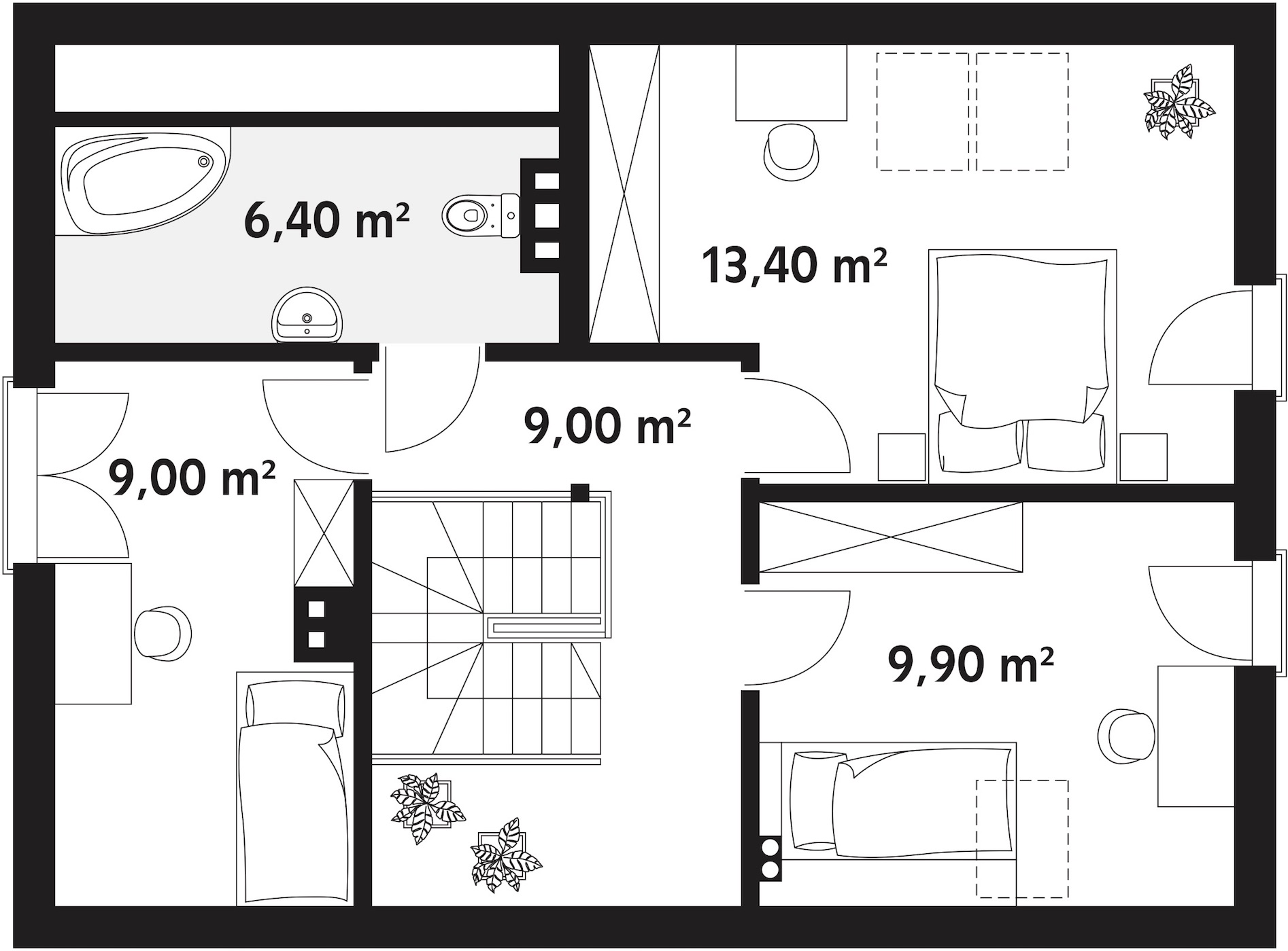 Do części nocnej zlokalizowanej na piętrze prowadzą schody sosnowe. Na środku zaplanowano spory korytarz i wizualnie efektowną klatkę schodową. Zabezpieczenie stanowi tu balustrada drewniana w standardzie. Znajdują się tu trzy ustawne sypialnie. W największym pokoju niewielkiego domu mieszkalnego przeznaczonym dla gospodarzy jest zaprojektowana wnęka pod zabudowę, którą można oddzielić jako osobną garderobę. Na piętrze usytuowana została również druga, wspólna łazienka.