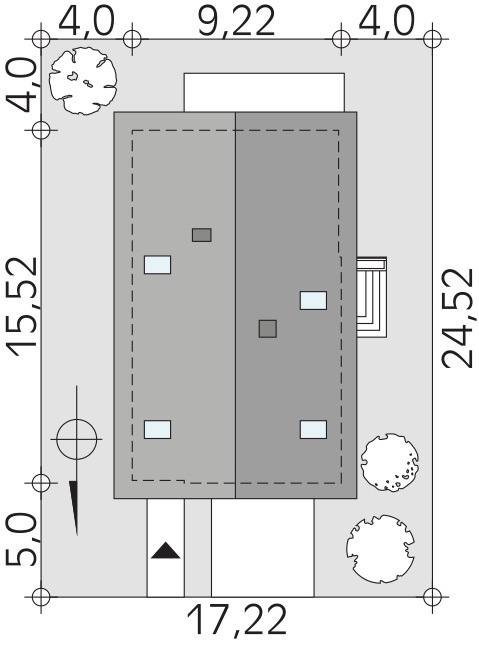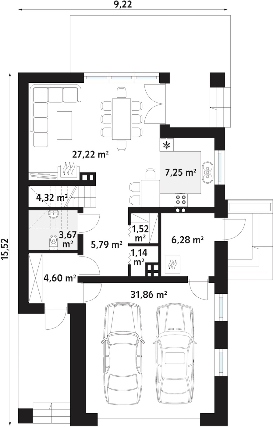 Ponadto warto zwrócić uwagę, że jest to dom z dwustanowiskowym garażem. Dopasowuje się tym do obecnej sytuacji w wielu rodzinach i rozwiązuje problem parkowania dwóch aut, zwłaszcza u inwestorów planujących budowę domu za miastem.