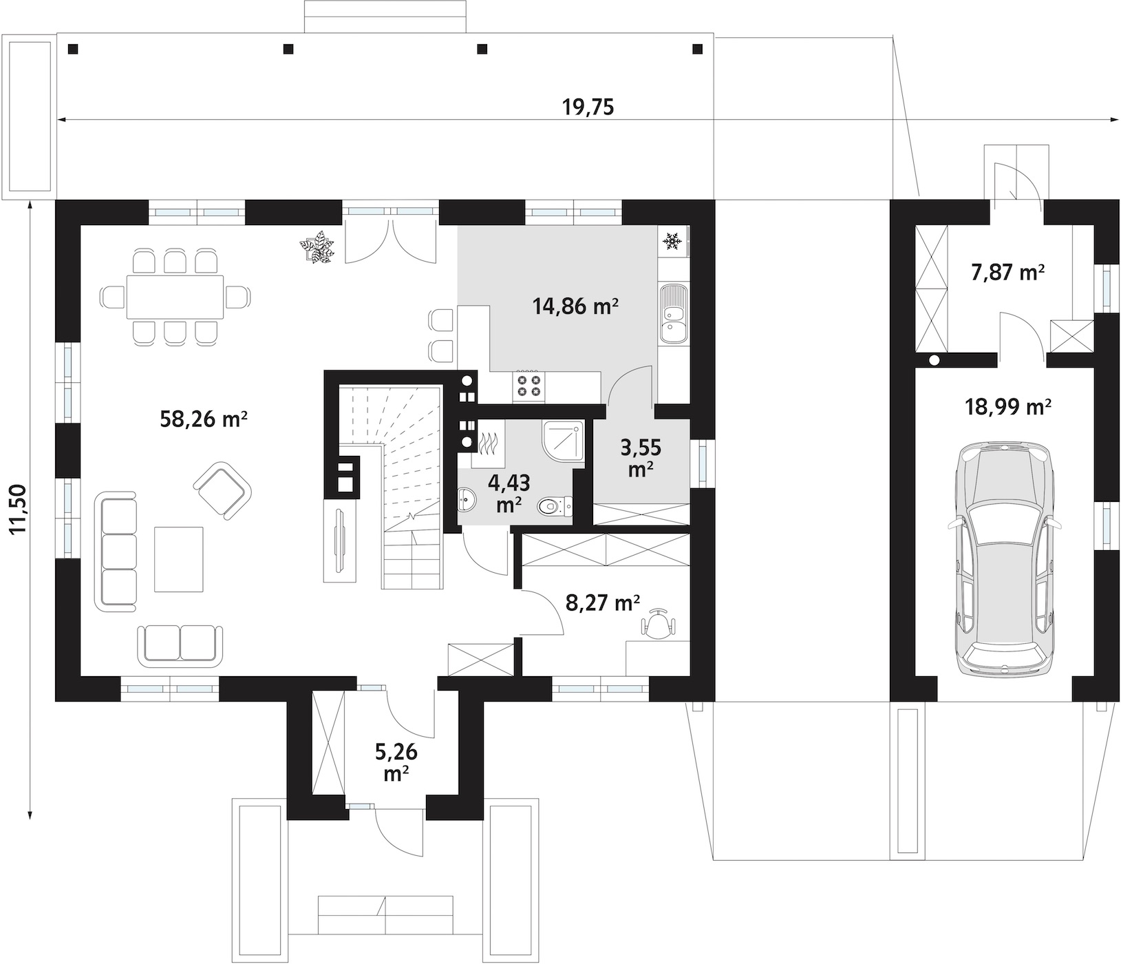 Wiata znajdująca się na zewnątrz łączy garaż oraz pomieszczenie gospodarcze z całym domem. W domach, które nie są podpiwniczone (co jest rozwiązaniem bardzo ekonomicznym) niezwykle przydatne jest takie pomieszczenie techniczne, które możemy wykorzystać w zależności od naszych potrzeb.