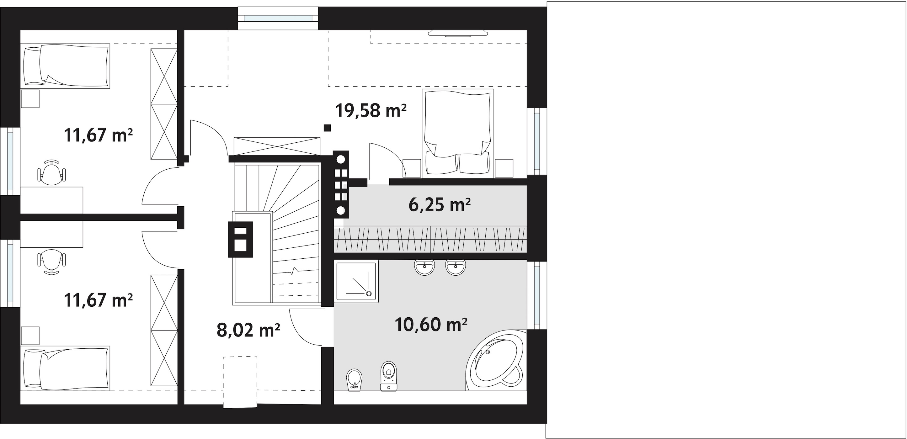 Piętro na które prowadzą drewniane schody powinno zadowolić mieszkańców. Oprócz dużej, przestronnej klatki schodowej połączonej z korytarzem znajdują się tu dwa prostokątne pokoje, które są takiej samej wielkości. Uwagę zwraca tu spora sypialnia rodziców, która jest połączona z prywatną, dużą garderobą. Ponadto domownicy ucieszą się z ogromnej łazienki, w której zmieszczą się wszystkie niezbędne sanitaria.