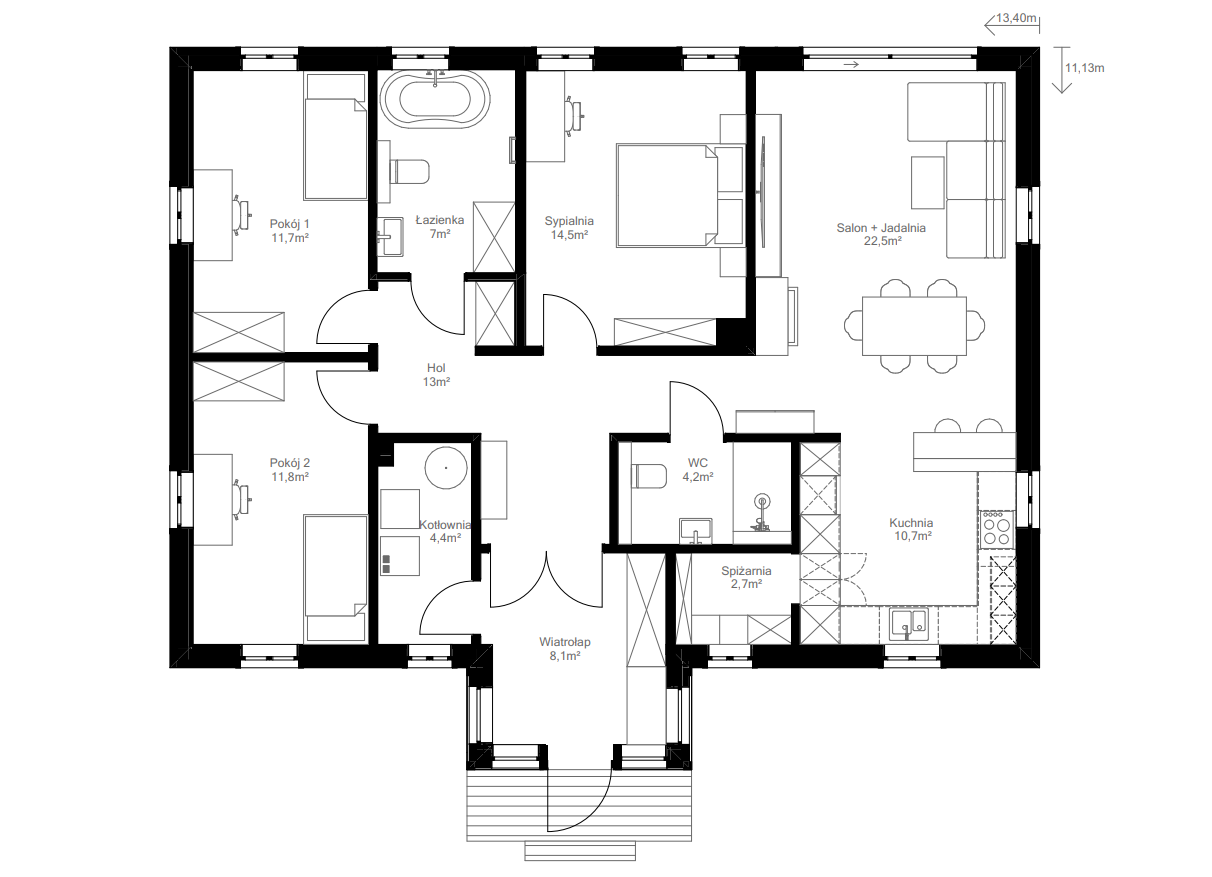 Rudawka (Podlaski 111) to nowoczesna interpretacja tradycyjnego podlaskiego domu — prosta, harmonijna bryła, drewniana elewacja z ozdobnymi podokiennikami i charakterystyczny ganek tworzą ciepły, sielski klimat. Dom ma funkcjonalny i bardzo czytelny układ: szeroki hol prowadzi równocześnie do strefy dziennej oraz do prywatnej części domu, gdzie znajdują się trzy wygodne sypialnie.