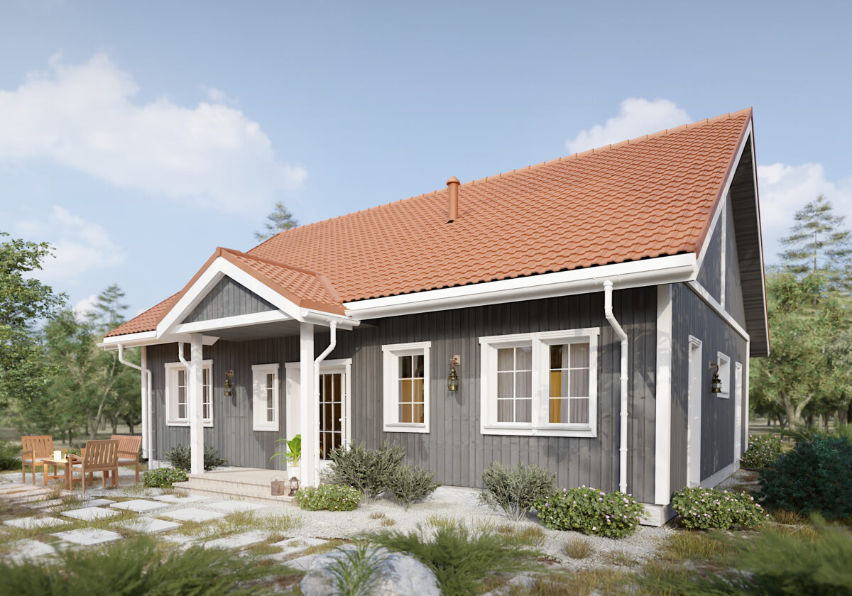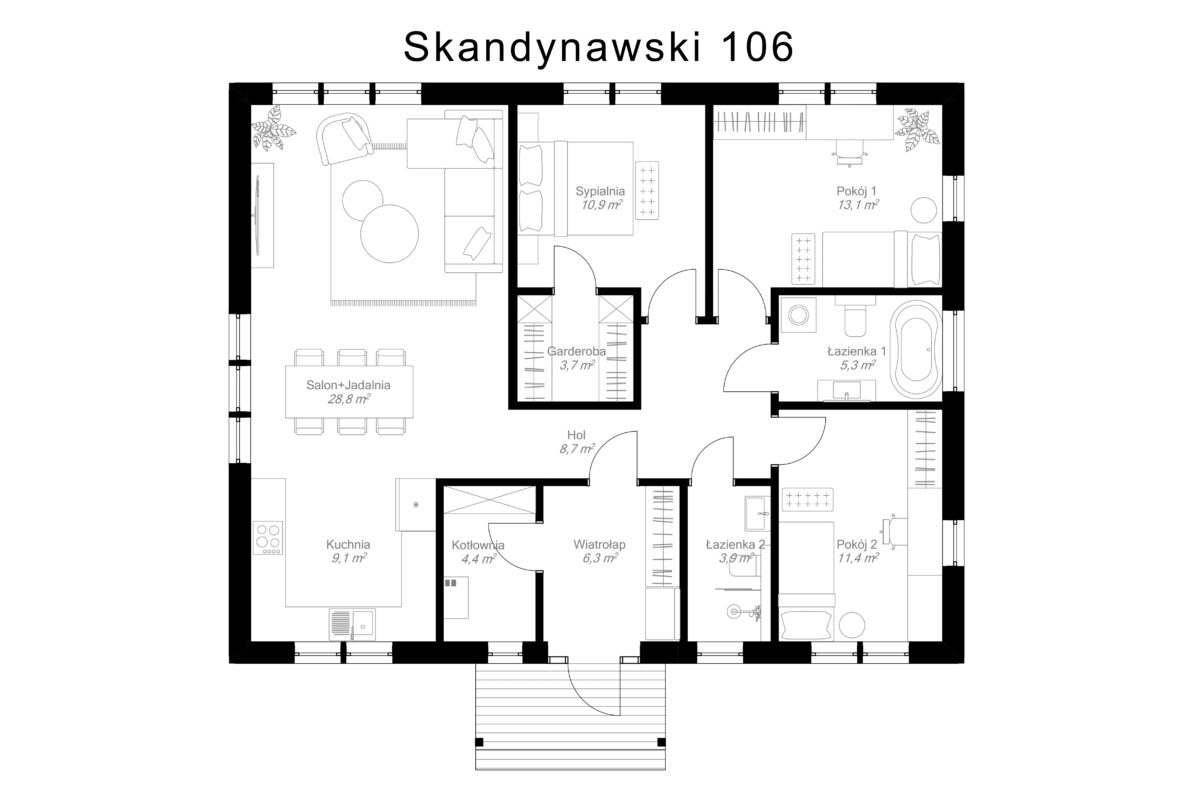 Domek skandynawski o powierzchni 106 m2 jest niezwykle często wybieranym projektem. Jest prosty ale ma w sobie wszystko, czego potrzeba rodzinie. W projekcie przewidziano trzy sypialnie, z których jedna może być główną sypialnią z własną garderobą. Dwie łazienki w tym domu niezwykle poprawiają komfort życia. Salon z kuchnią jest bardzo przestronny i przeszklony, dlatego może być ulubionym miejscem domowników.