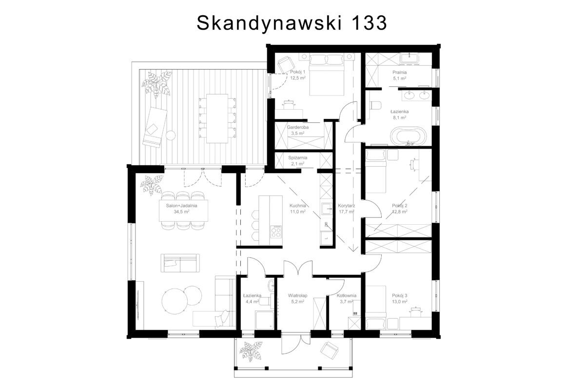 Ten na pozór prosty, klasyczny domek ma wyjątkowo funkcjonalny układ. Kształt litery L pozwala na oddzielenie salonu od reszty domu. Kuchnia jest tylko częściowo otwarta na resztę domu. W budynku znalazło się miejsce na pomieszczenia pomocnicze takie jak spiżarnia, garderoba, pralnia, kotłownia.
