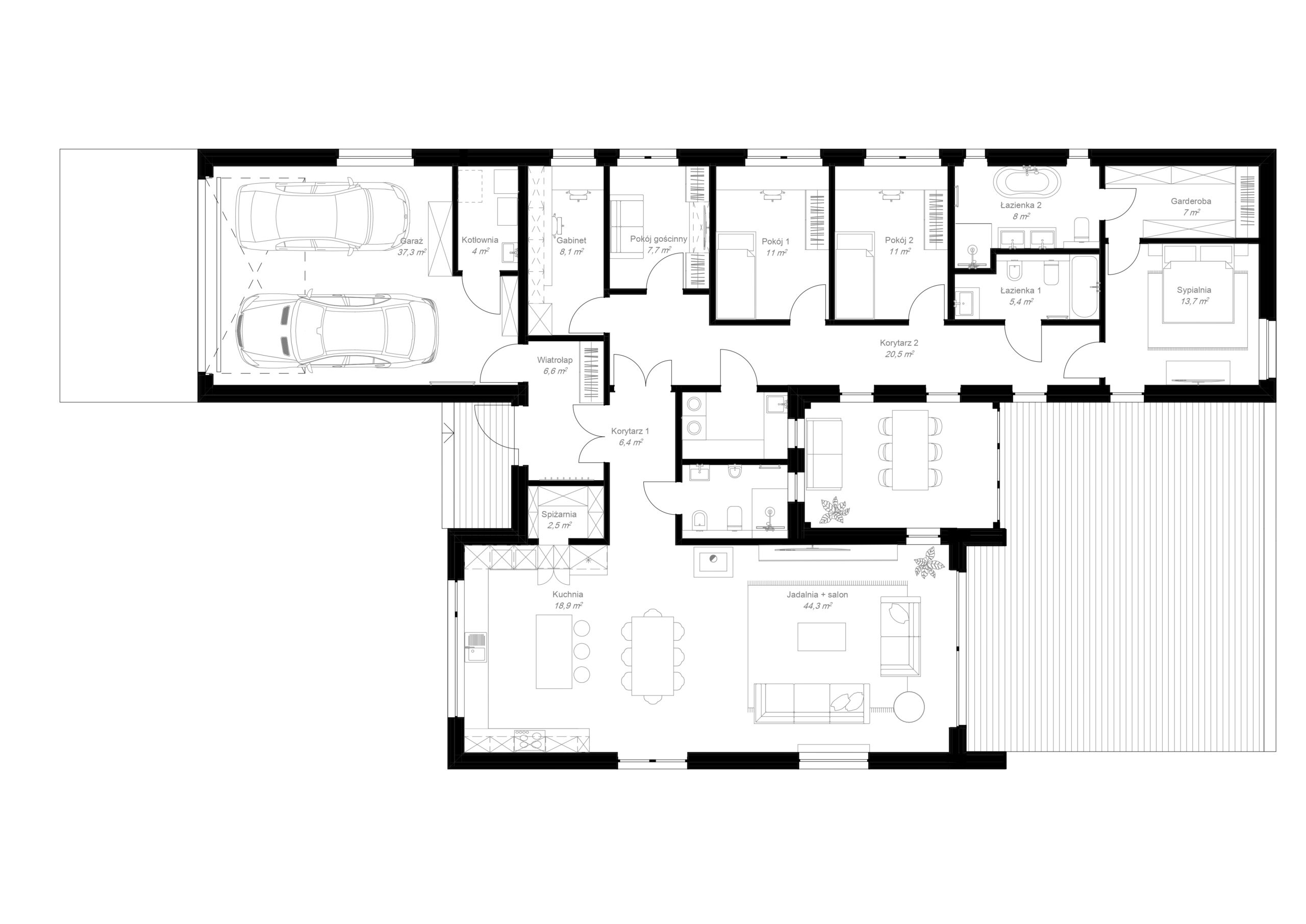 Projekt przewiduje wyraźny podział na część dzienną oraz prywatną. W sercu domu znajduje się przestronny salon połączony z jadalnią (44,3 m²) i otwartą kuchnią (16,9 m²), uzupełnioną o praktyczną spiżarnię. Duże przeszklenia zapewniają dostęp do naturalnego światła i bezpośrednie wyjście na taras.