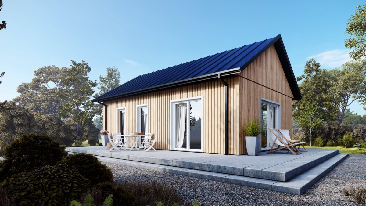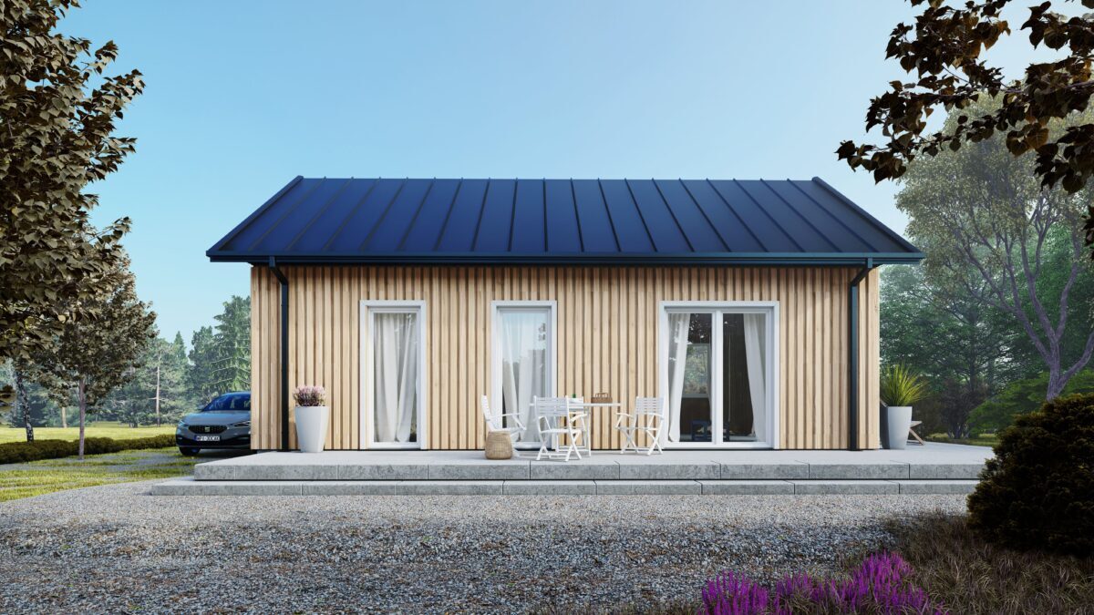 Dom skandynawski o powierzchni 57 metrów kwadratowych to niewielka, przytulna nieruchomość, charakteryzująca się typowym skandynawskim stylem projektowania, który łączy w sobie funkcjonalność, prostotę oraz naturalne materiały. Dom posiada dwie sypialnie oraz salon połączony z kuchnią. Jest to układ pomieszczeń typowy dla tego rodzaju nieruchomości, który sprzyja przepływowi światła i zapewnia funkcjonalność.