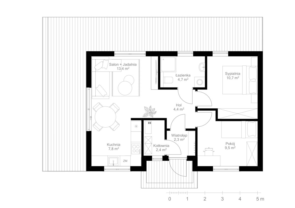 Propozycja projektu domu Skandynawski 57, jest skierowana do 2-3 osobowej rodziny. Metraż jest niewielki, natomiast rozkład pomieszczeń pozwoli domownikom odnaleźć komfort i poczucie optymalnej przestrzeni. Dom został podzielony na strefy: dwie sypialnie oraz strefę dzienną, czyli salon z kuchnią . Łazienka umiejscowiona została w centralnej części domu.
