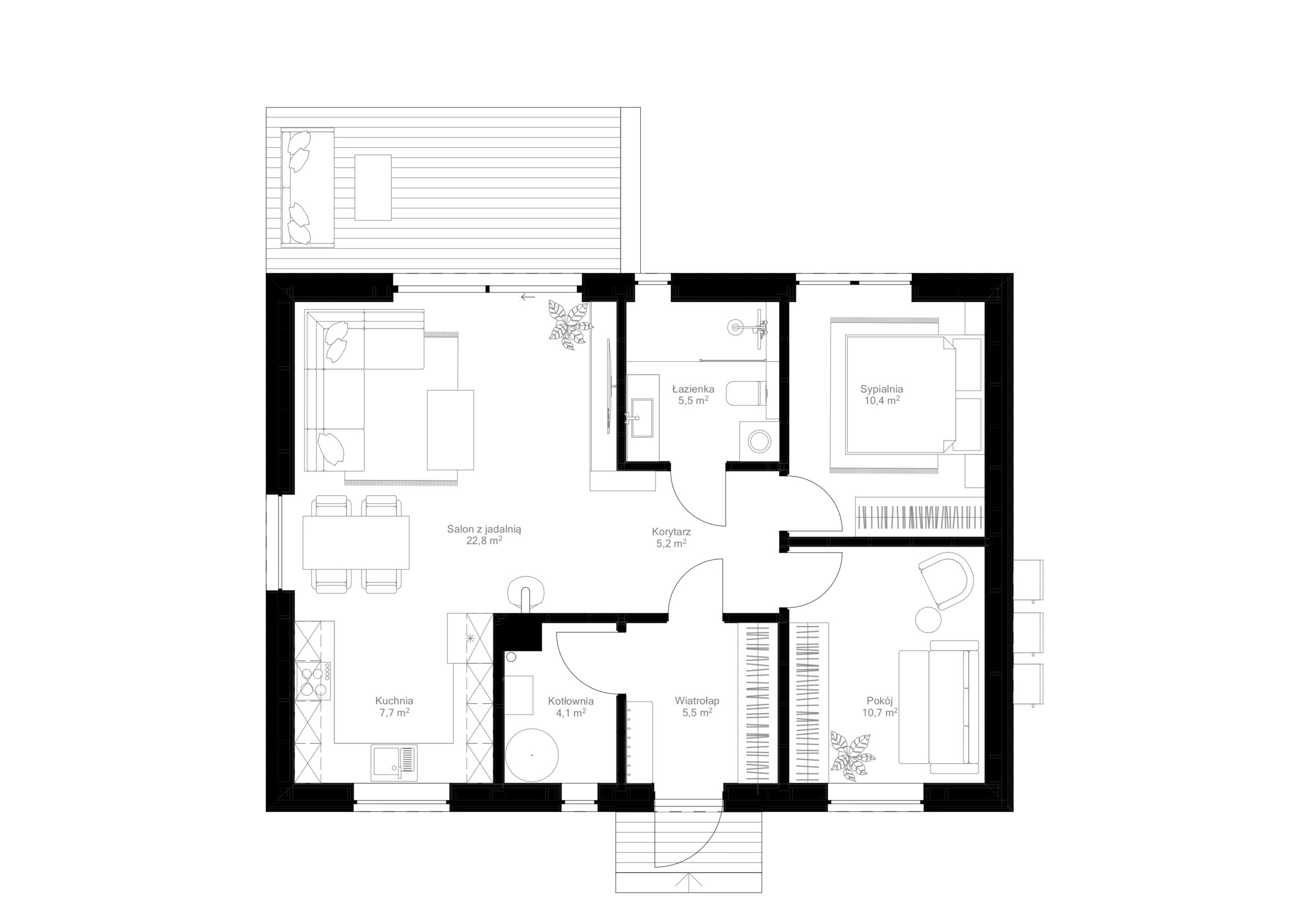 W centrum znajduje się salon z jadalnią (22,8 m²) połączony z otwartą kuchnią (7,7 m²), tworząc jasną i spójną strefę dzienną z dostępem do tarasu. W części prywatnej przewidziano dwie sypialnie oraz funkcjonalną łazienkę (5,5 m²).