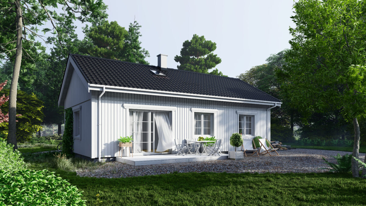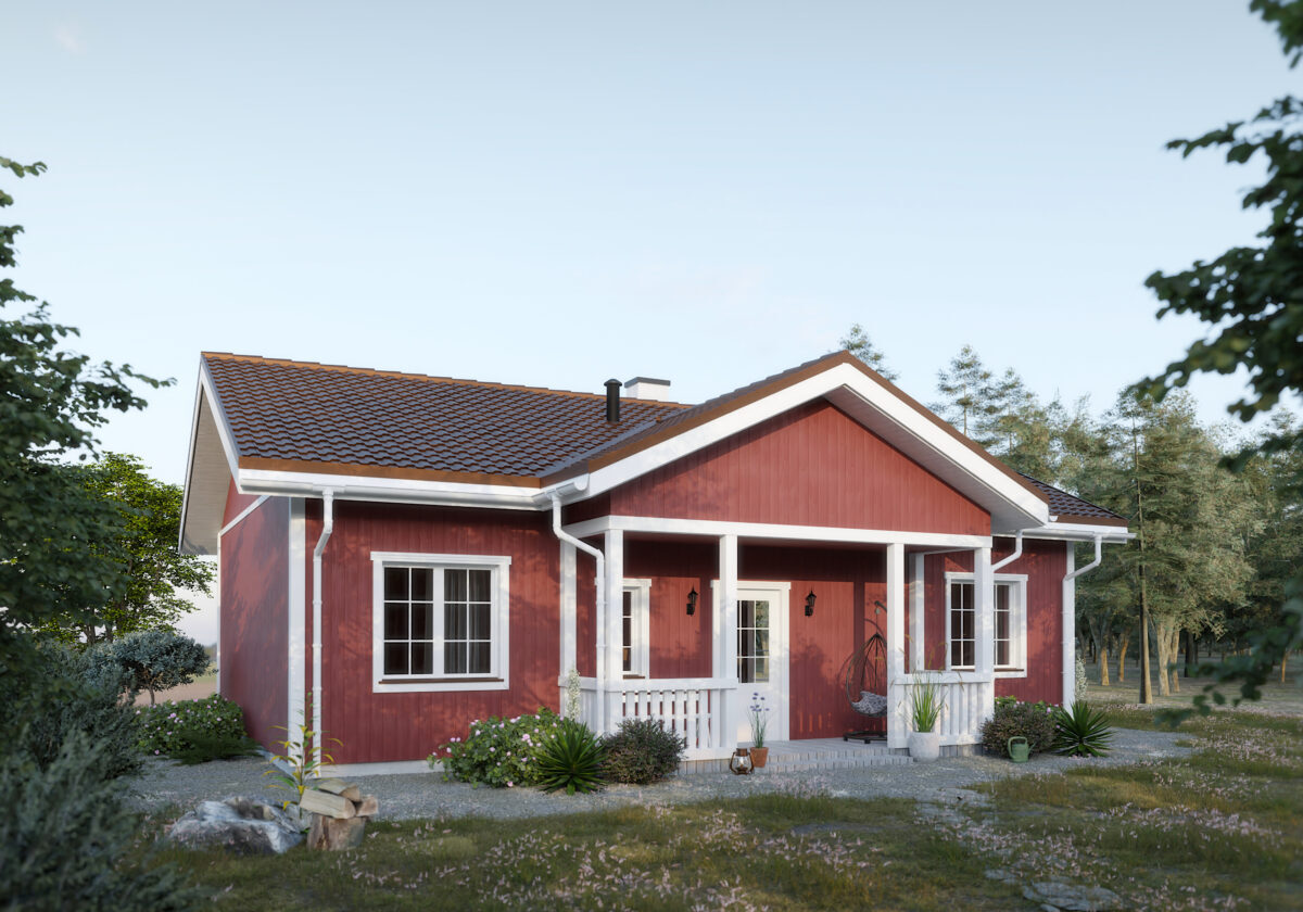 Skandynawski 78 to bardzo interesujący dom. Z pozoru prosta, klasyczna bryła została urozmaicona gankiem. Dzięki temu dom zyskał wyjątkowy charakter. Ganek pozwoli cieszyć się otoczeniem i zachęcać do spędzania czasu na świeżym powietrzu. Warto tutaj zwrócić uwagę na kontrast pomiędzy deską elewacyjną, a stolarką okienną i obróbkami blacharskimi.