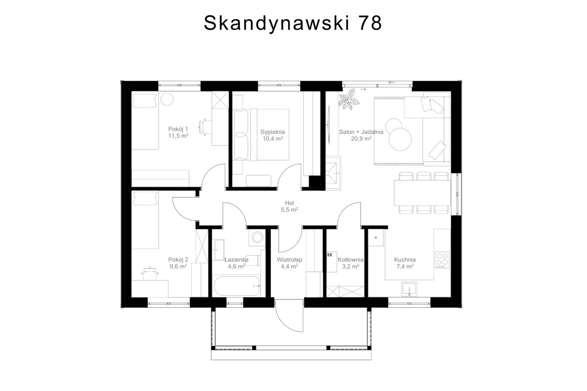 Na niewielkiej powierzchni zostały zaprojektowane 3 sypialnie, salon z kuchnią, łazienka i kotłownia. Mały metraż pozwala zminimalizować koszty utrzymania domu, a także- co bardzo ważne koszty budowy. Jest to kolejny projekt, który śmiało możemy zaproponować rodzinie.