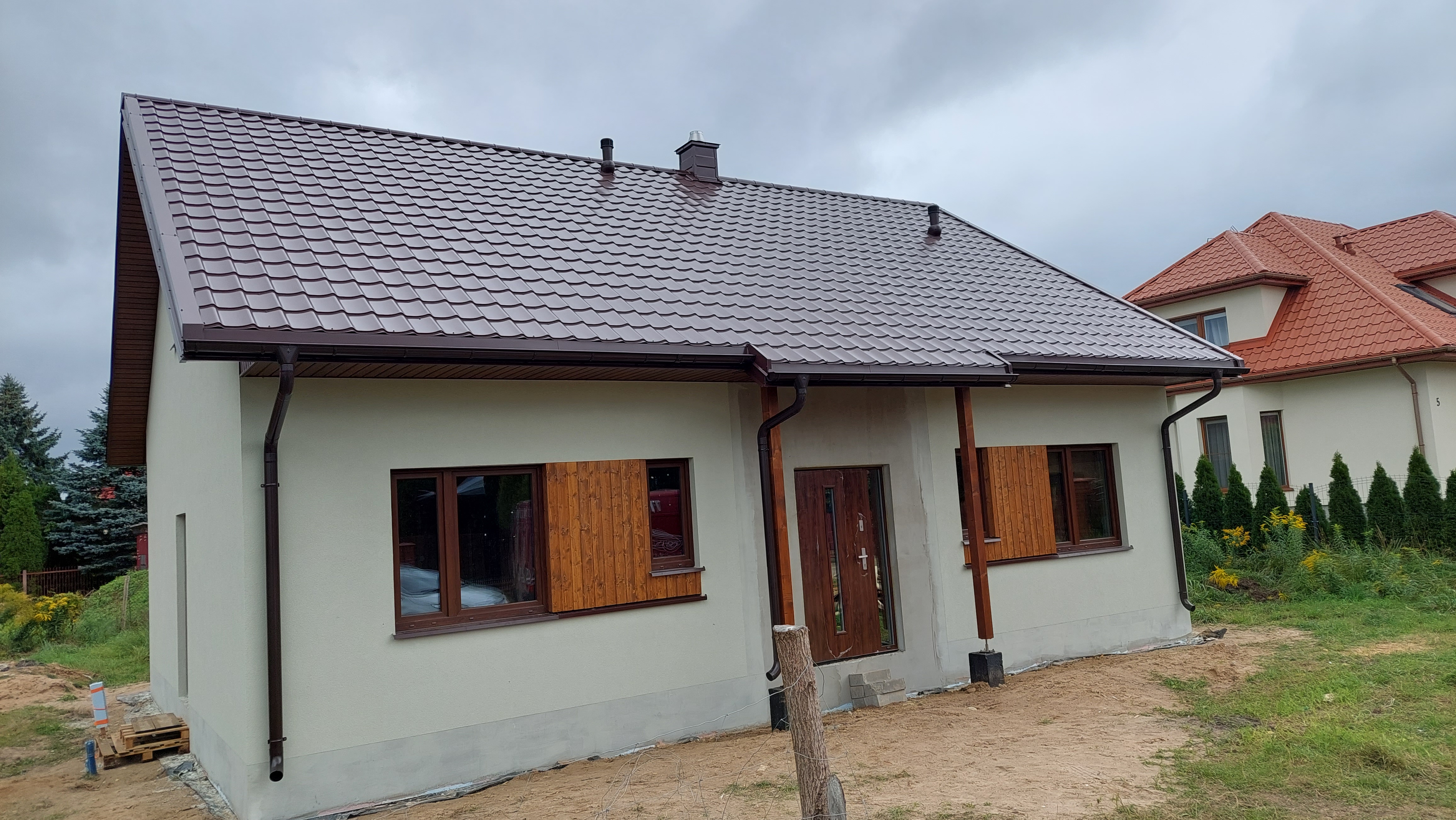 Dach z okapem został wykończony brązową blachodachówką, która dobrze wpisuje się w naturalną stylistykę budynku. Elewacja łączy trzy materiały: biały tynk, deskę elewacyjną oraz płytkę klinkierową – to zestawienie faktur i kolorów nadaje bryle głębi i charakteru.