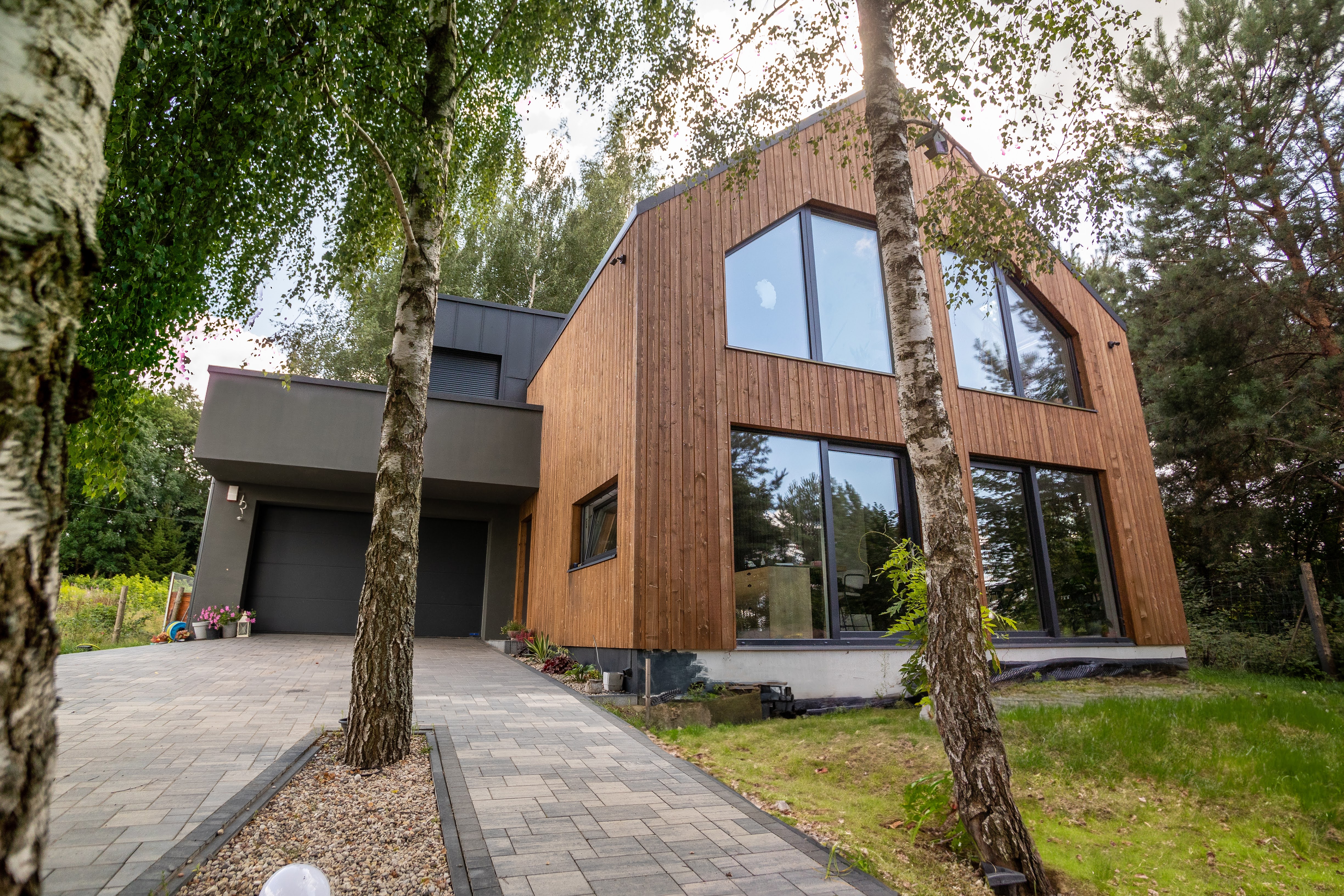 Stworzeniem murowanego garażu z żelbetowym stropem we własnym zakresie zajął się inwestor, natomiast my wykonaliśmy resztę w technologii szkieletowej. Powierzchnia całego domu wynosi 207 m2.