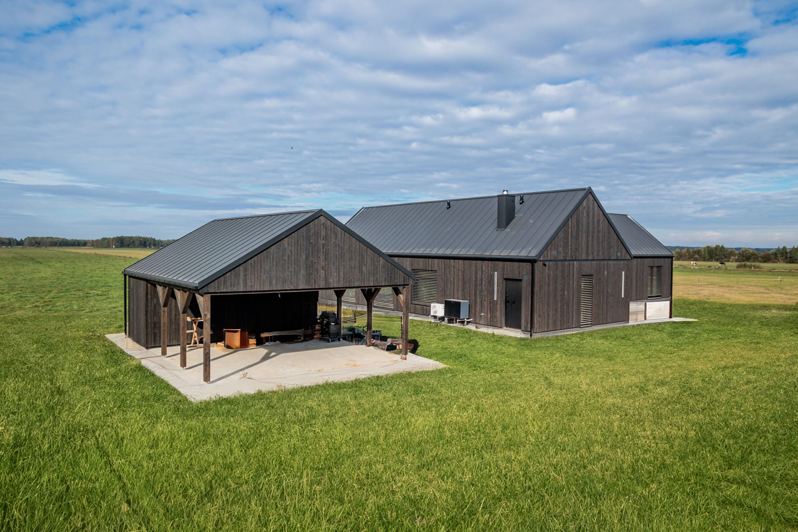 Elewacja wiaty została wykończona czarną deską świerkową o szorstkiej fakturze, co podkreśla minimalistyczny, nowoczesny charakter i zapewnia trwałość na lata.